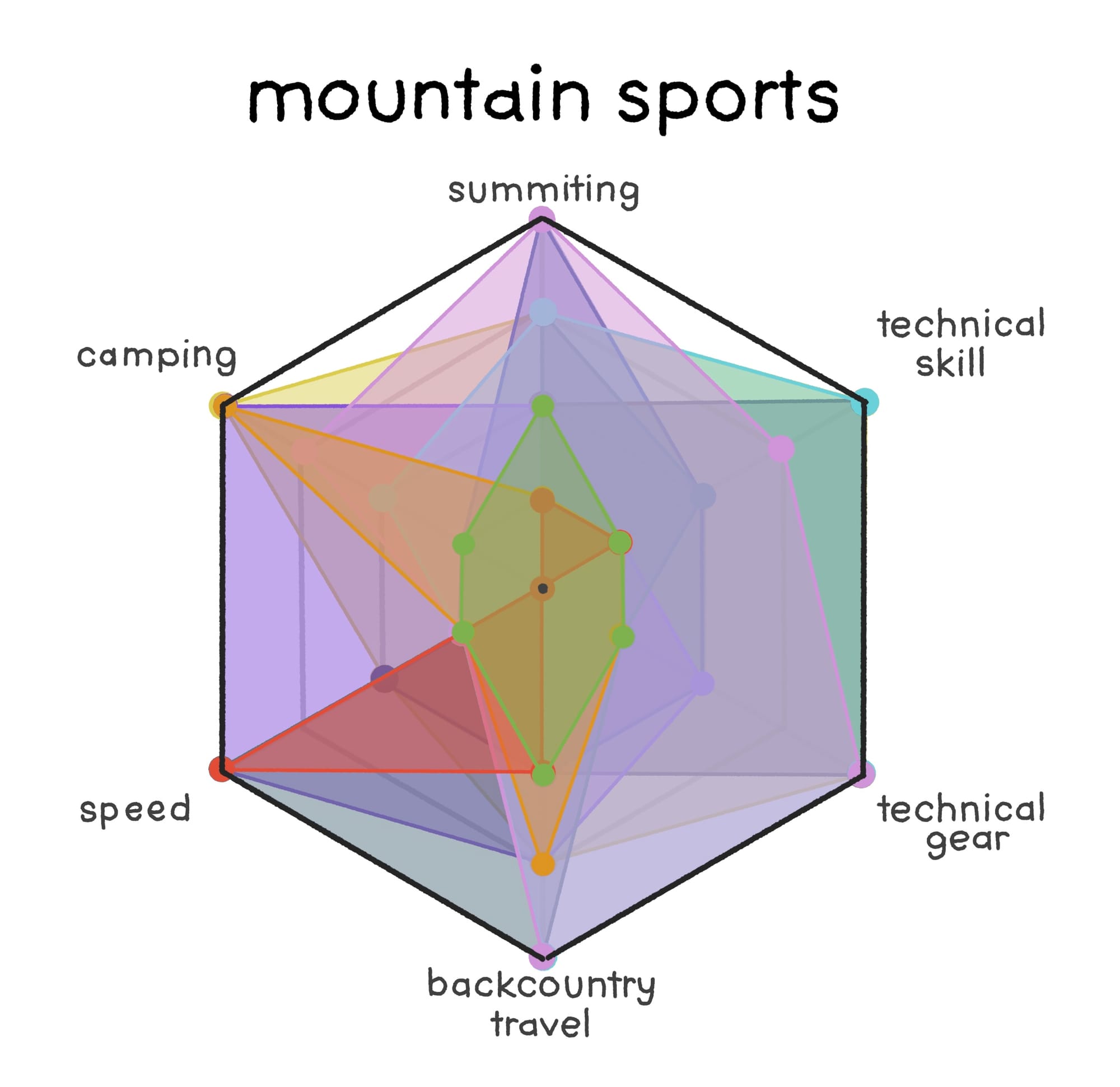 In the continued interest in brevity, I have compiled a dozen different variations of mountain sports and plotted them all on a six-dimensional graph to help you understand what people mean when they use those terms (and more specifically what I mean when I write them). These are not meant to be deep-dives or comprehensive representations of those sports (which each have their own niches to dive deeper into), but to give a thesaurus to curious outsiders and a fun thing to argue about for pedantic online commenters!