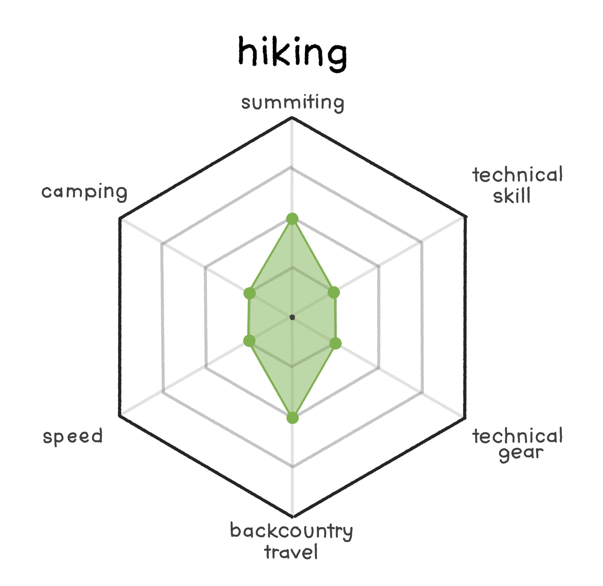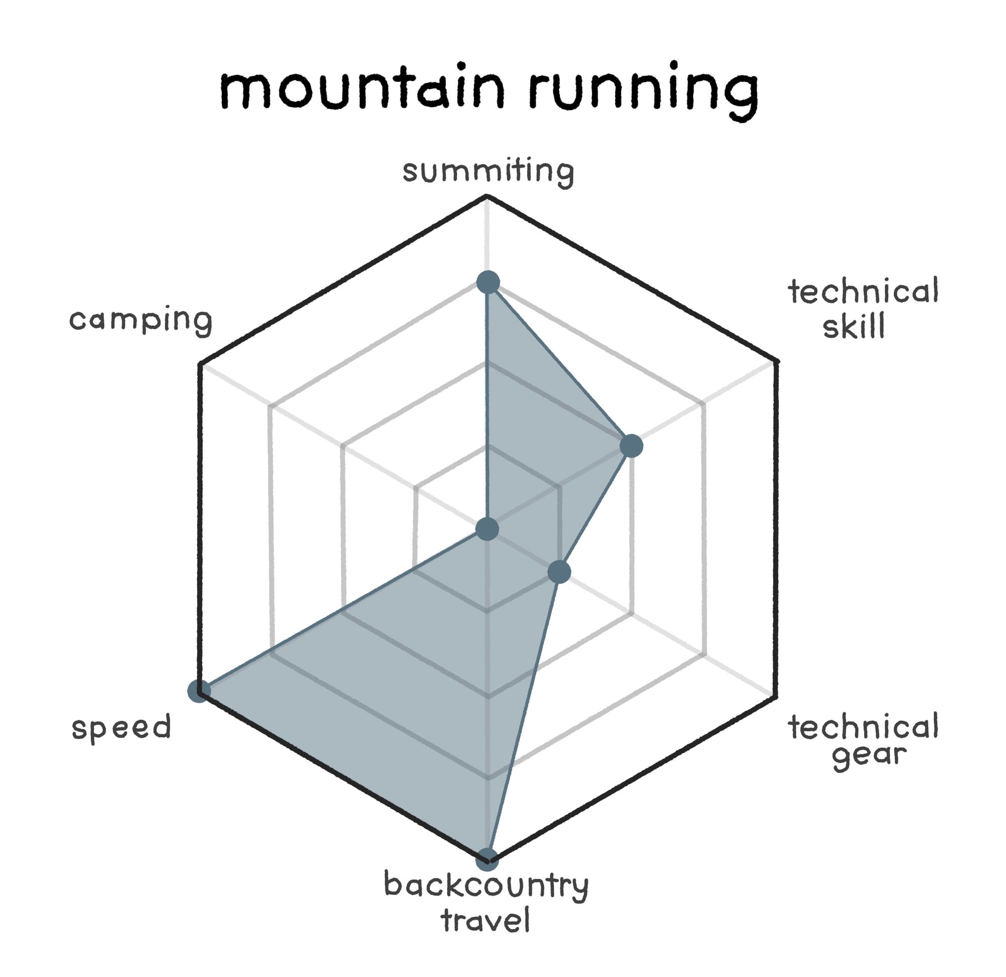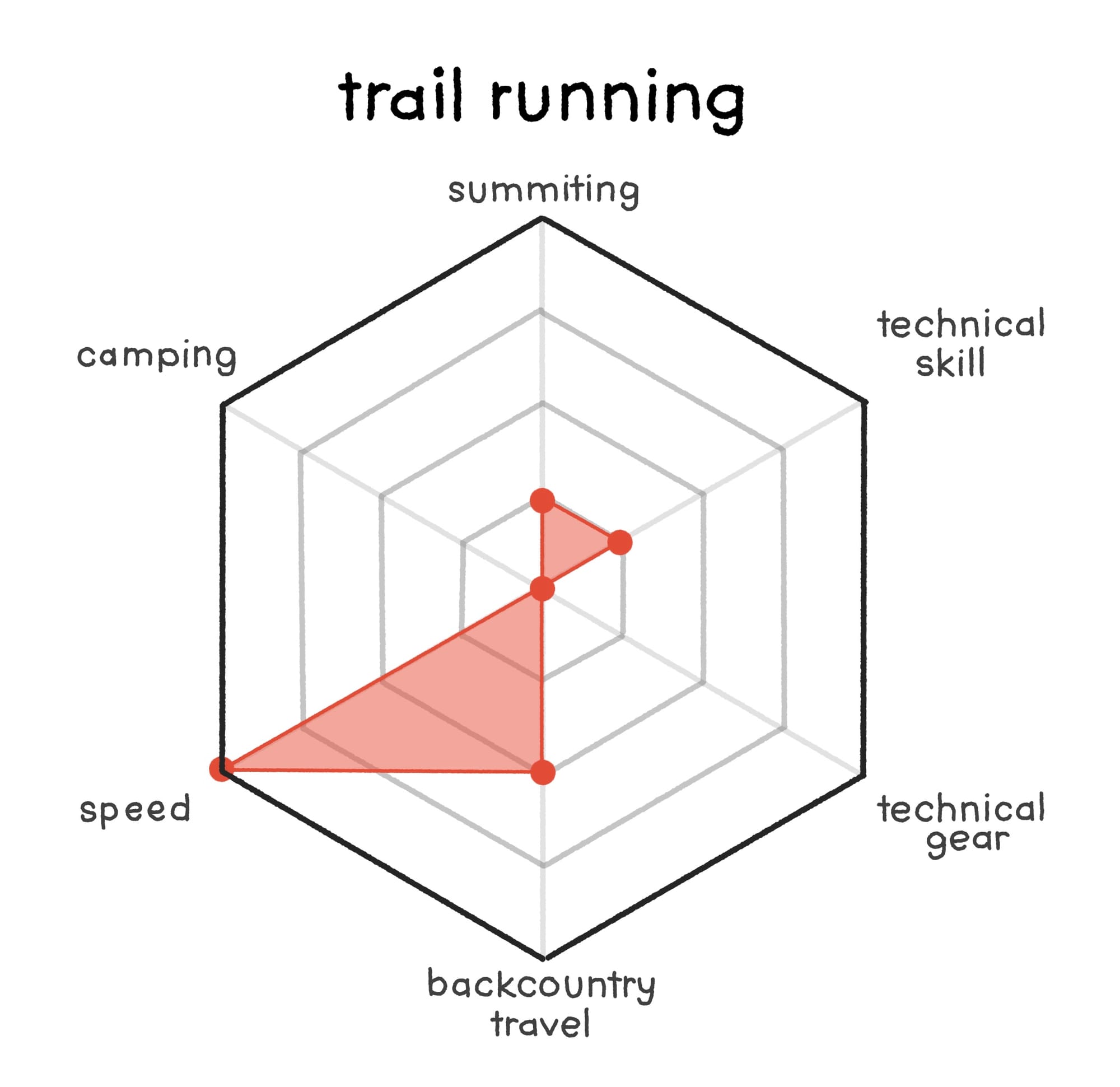 Trail running is a small step away from hiking in many regards – it requires essentially no new skills – just a shift of mindset. To focus on speed over leisure, and a slightly higher bar for required cardiovascular endurance. The graph shows this, taking a few points away here and there and placing all of them into "speed".