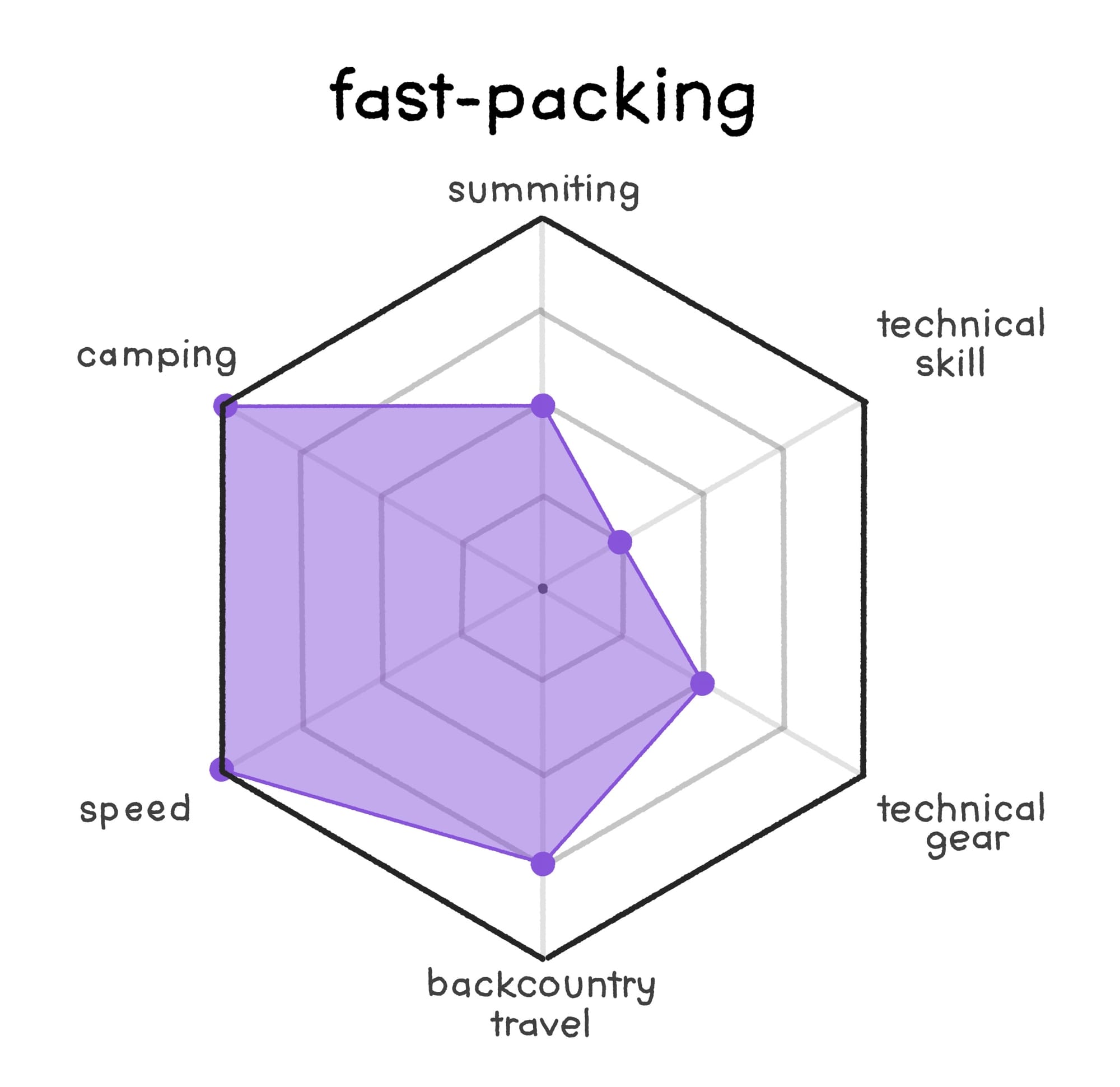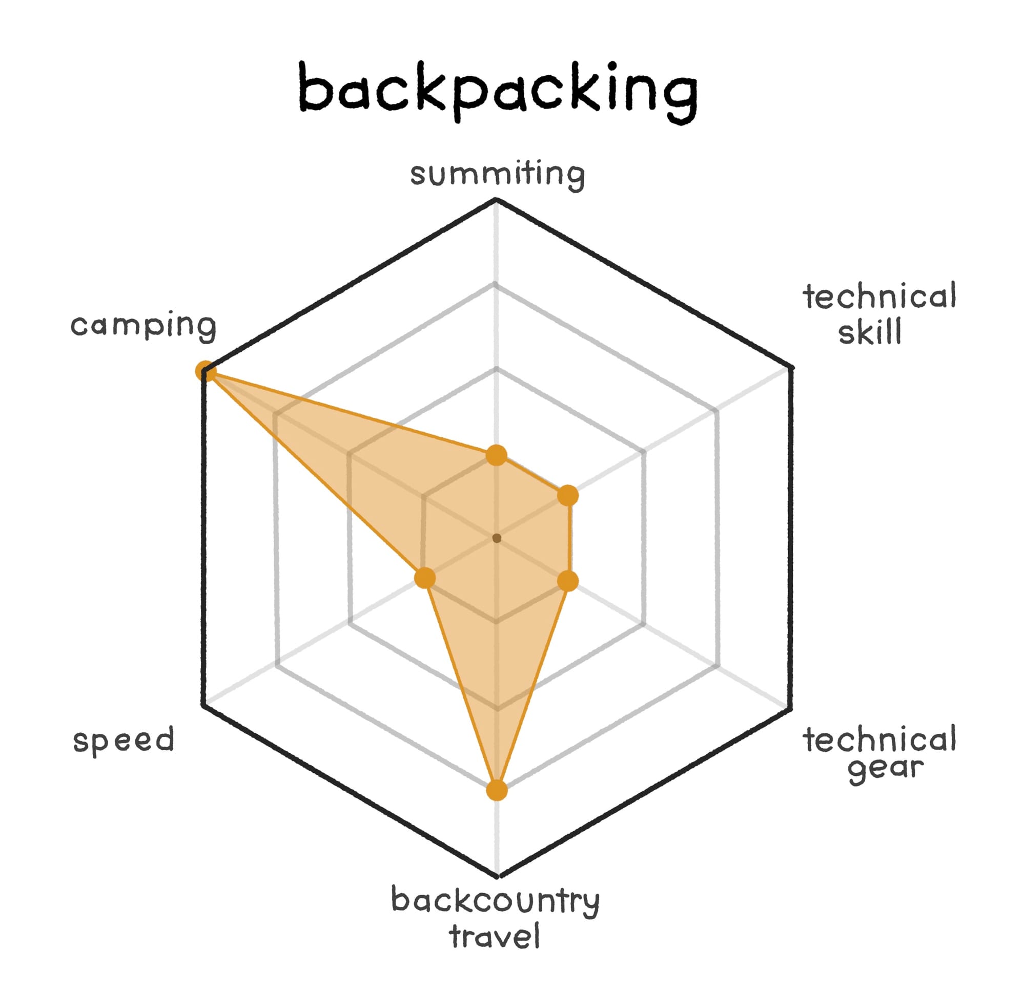 However, the term is generic enough that often just hearing "I'm going hiking" isn't quite enough to deduce exactly what they will be doing, and the graph reflects that. While someone rarely means that they will be camping, moving very fast, doing something requiring specialized skills or technical gear... we can't count any of them out completely!
