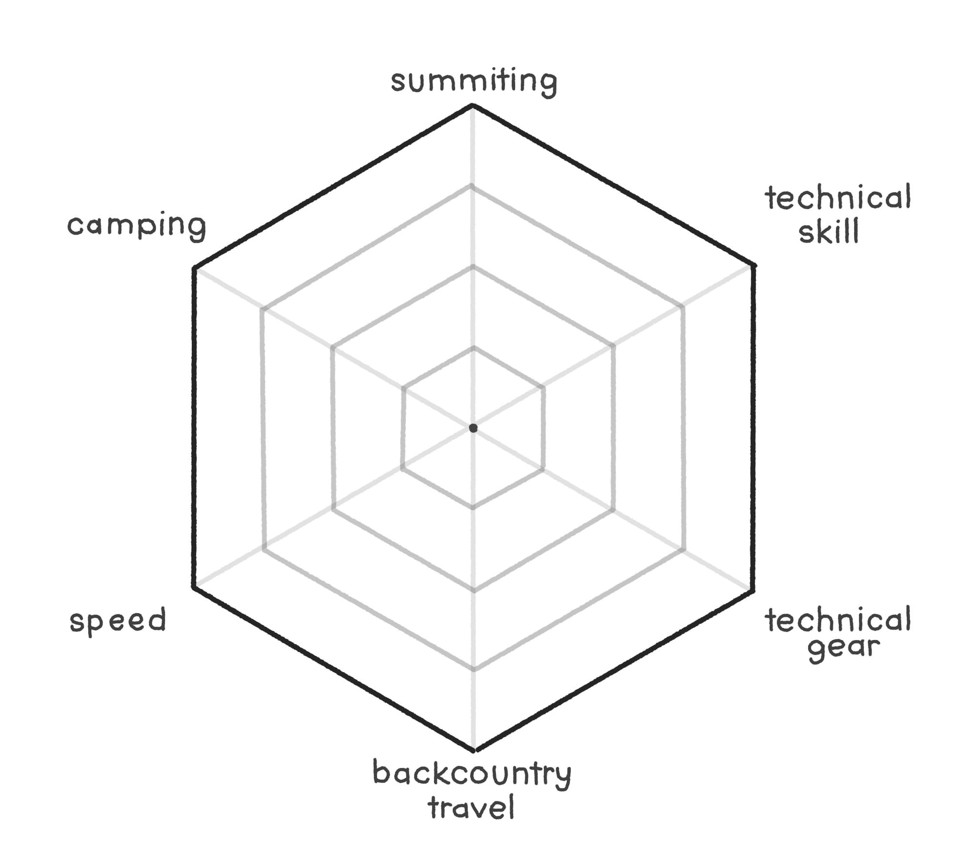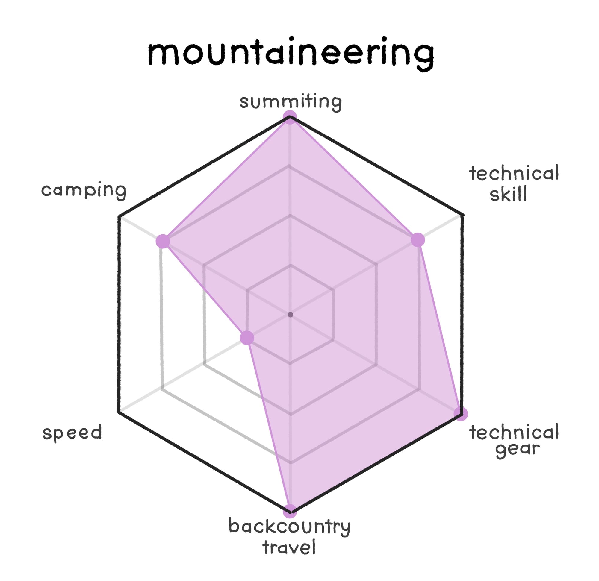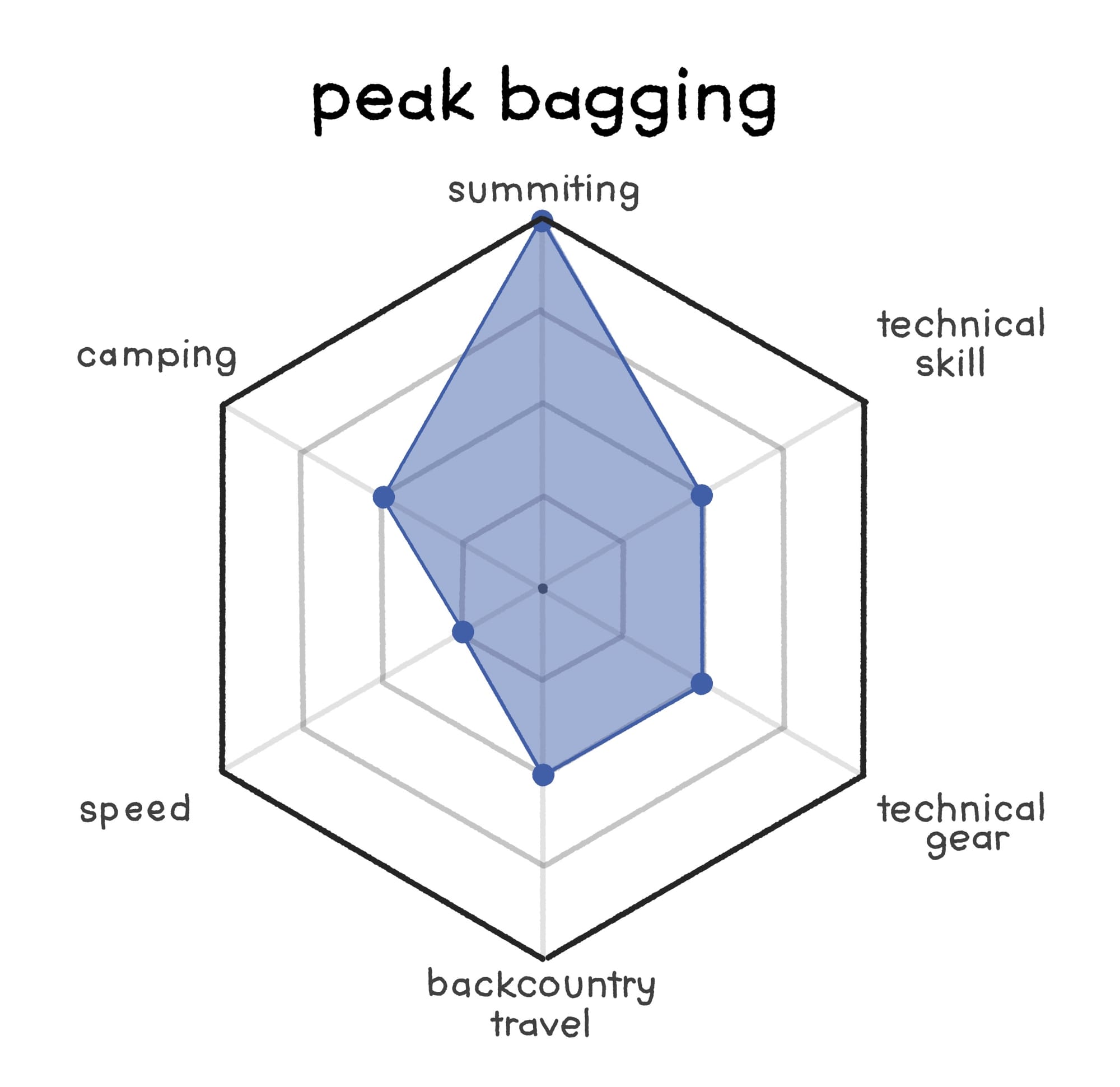 In many ways this is not a sport of its own, but instead a mindset one might have while entering into one of the other sports highlighted here. This is why the graph remains well balanced across all of the focuses, many methods may be required especially when ticking off "harder" peaks which fall into the realm of mountaineering. However, many self-proclaimed peakbaggers would also say they are just hikers.