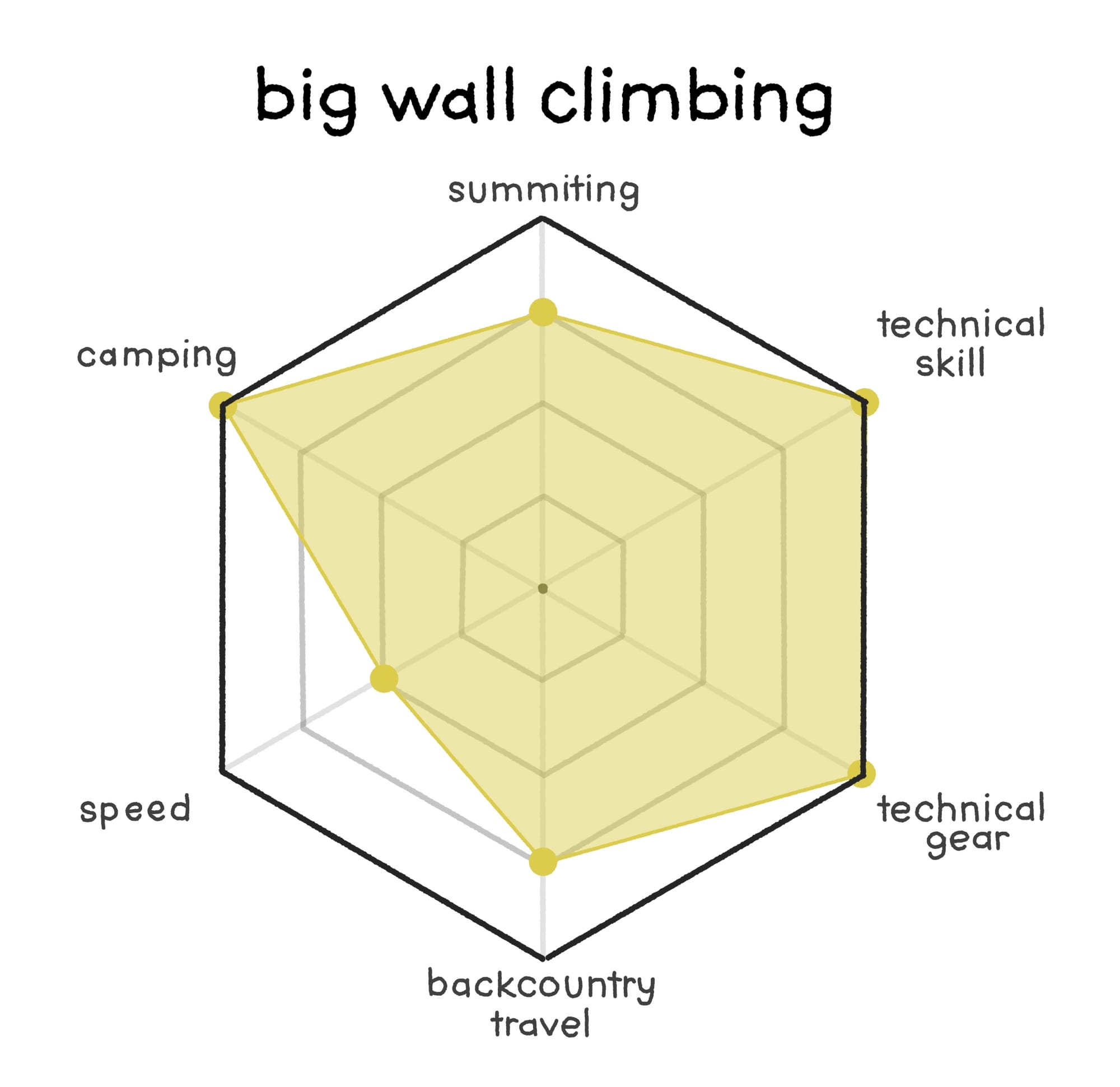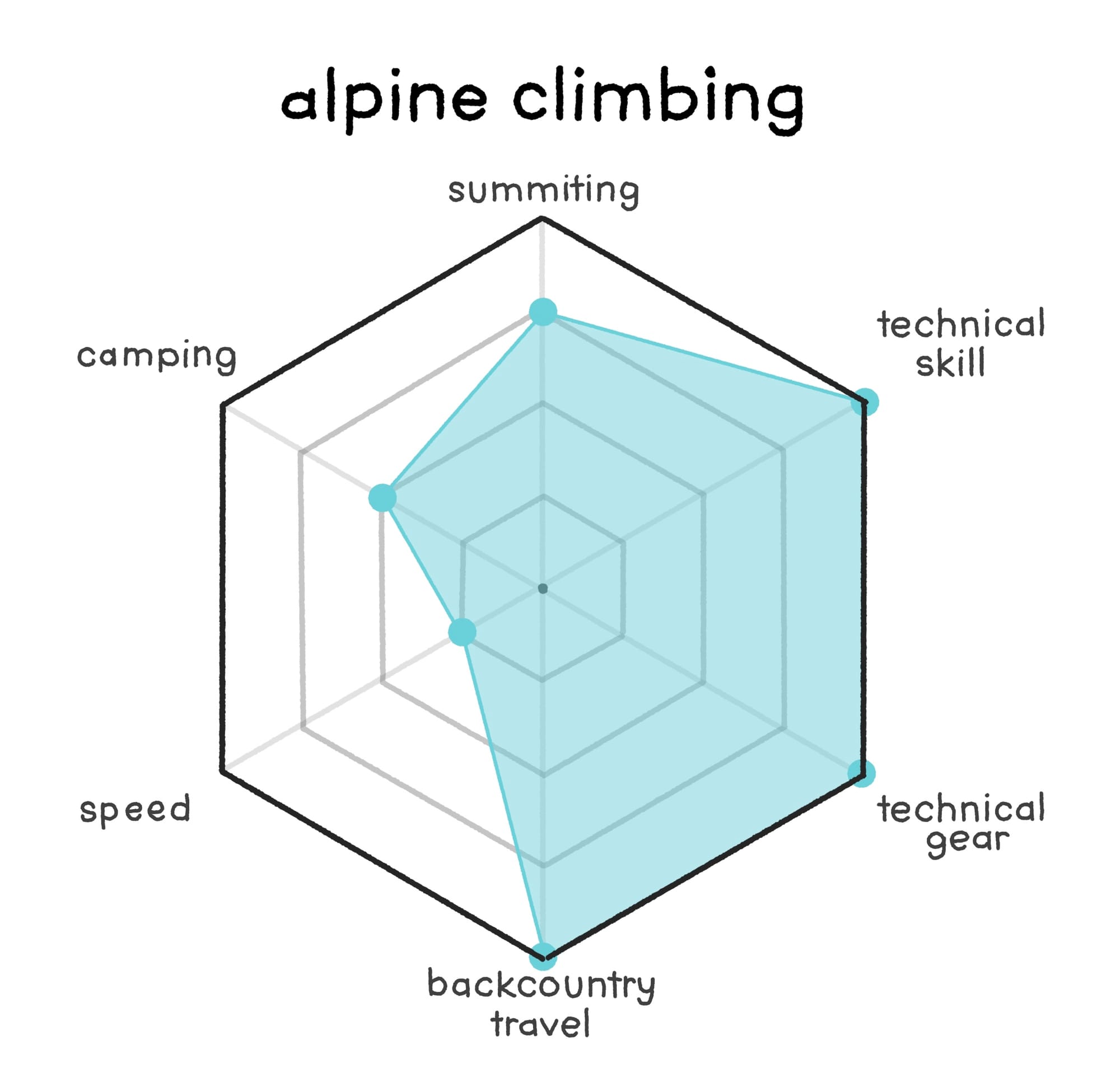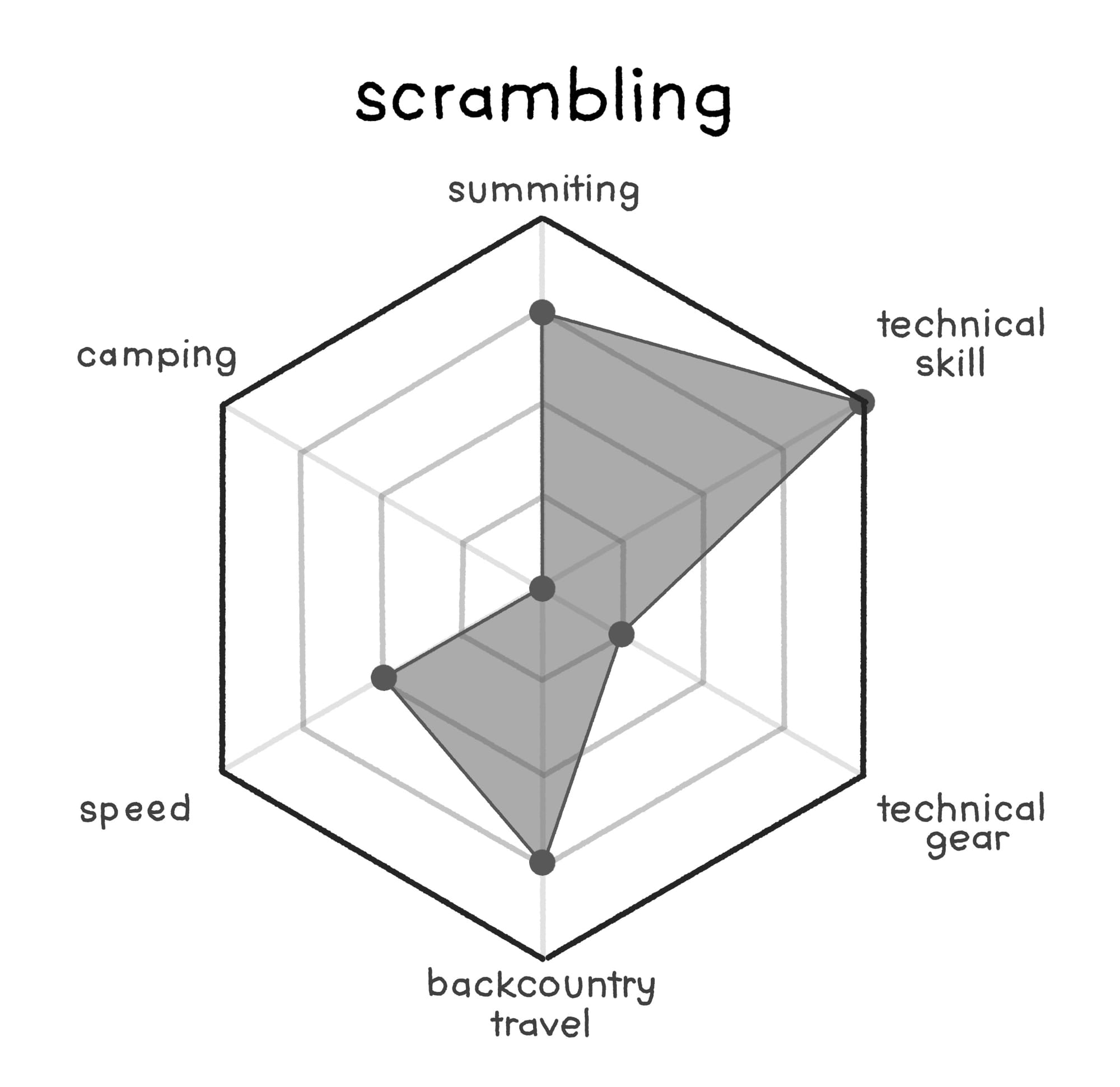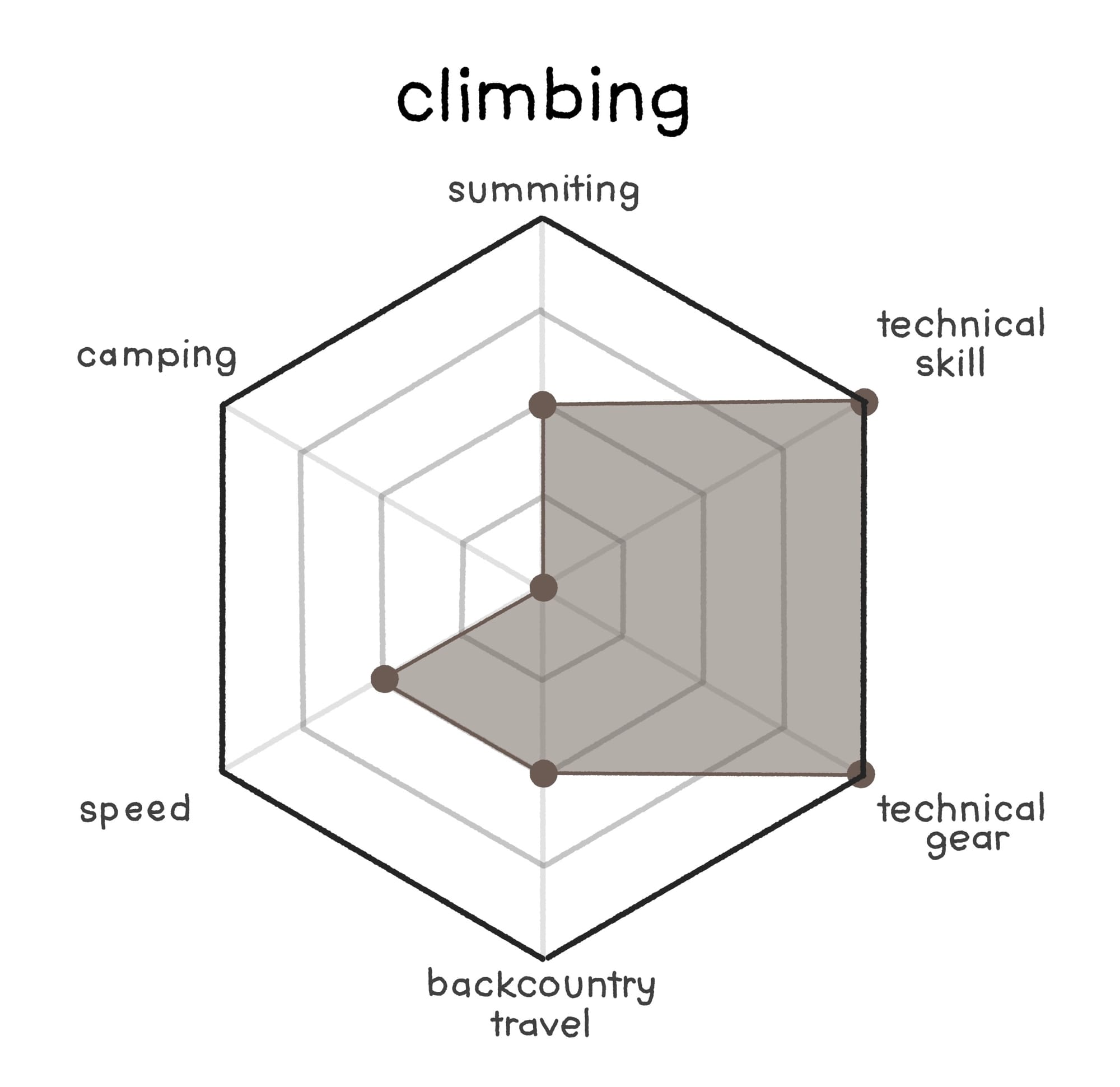 Climbing is the next building block as it is the opposite end of the spectrum from hiking in many regards, but still only consists of fundamental movements. We can use the chart to see at a glance how it differs from hiking. When people talk about "climbing" they are specifically calling out the need for both technical skill and gear in a way that "hiking" does not immediately invoke.