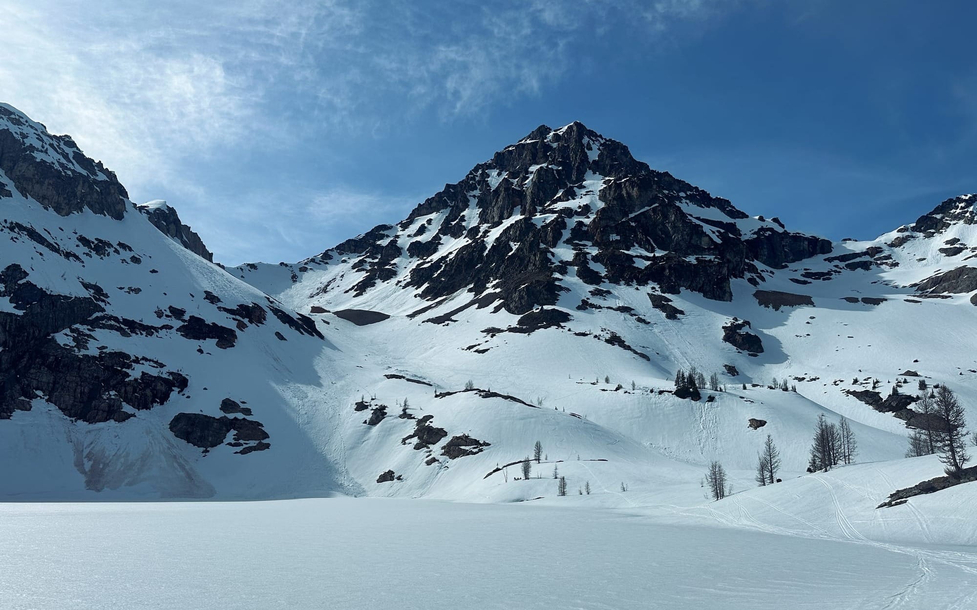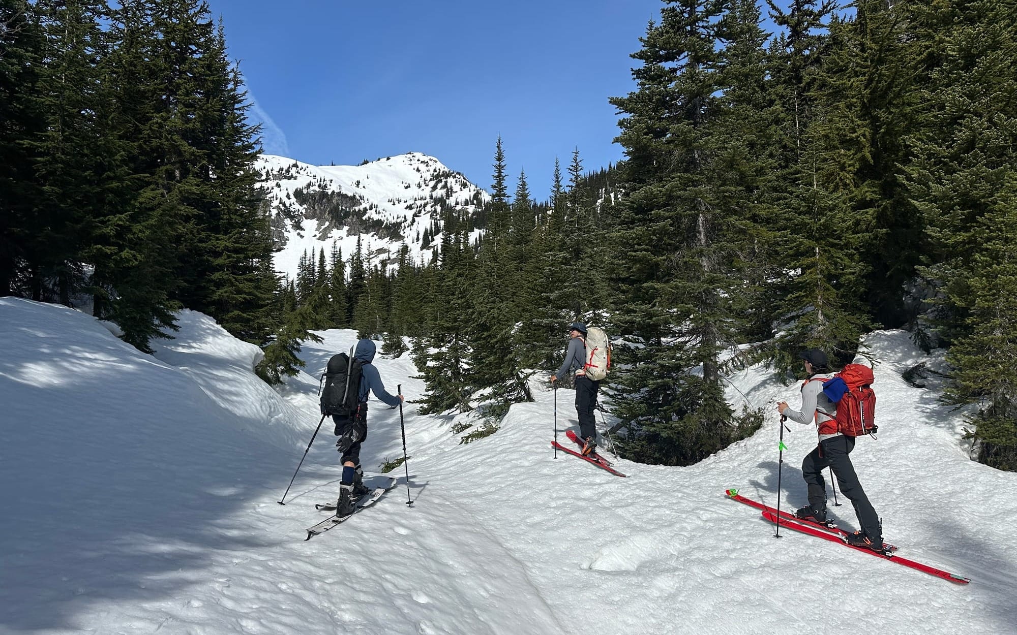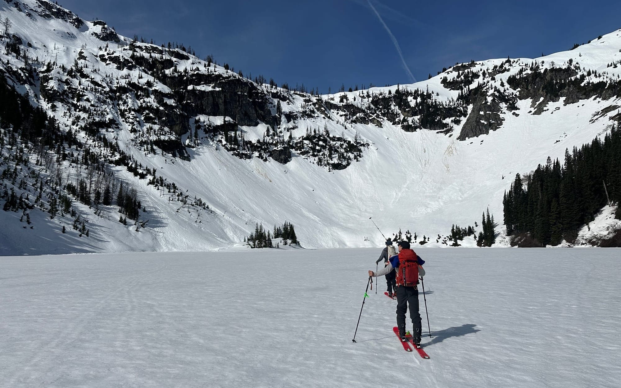 The forest was thick and full of deadfall so once we got past the initial climb (around 5400ft) we dropped down off of the summer trail and skinned the draining to Ann Lake. When we got to the edge of the lake we noticed some pooling forming as the surface ice began to melt around the edge of the lake, but the center looked solid and there were no open spots so we decided to skin across rather than adding time and traversing around the southern edge of the lake. Luckily it was solid and held under us without any issues and we made our way up the other side onto Heather Pass.