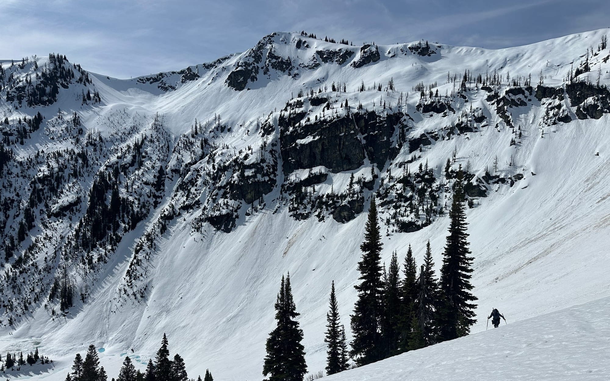 After a short creek crossing and two hours of bushwhacking, mud-walking, and post-holing, we escaped the dense forest and made it onto the open slopes of the lookers-right couloir.