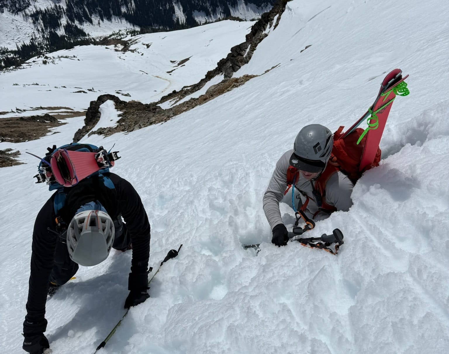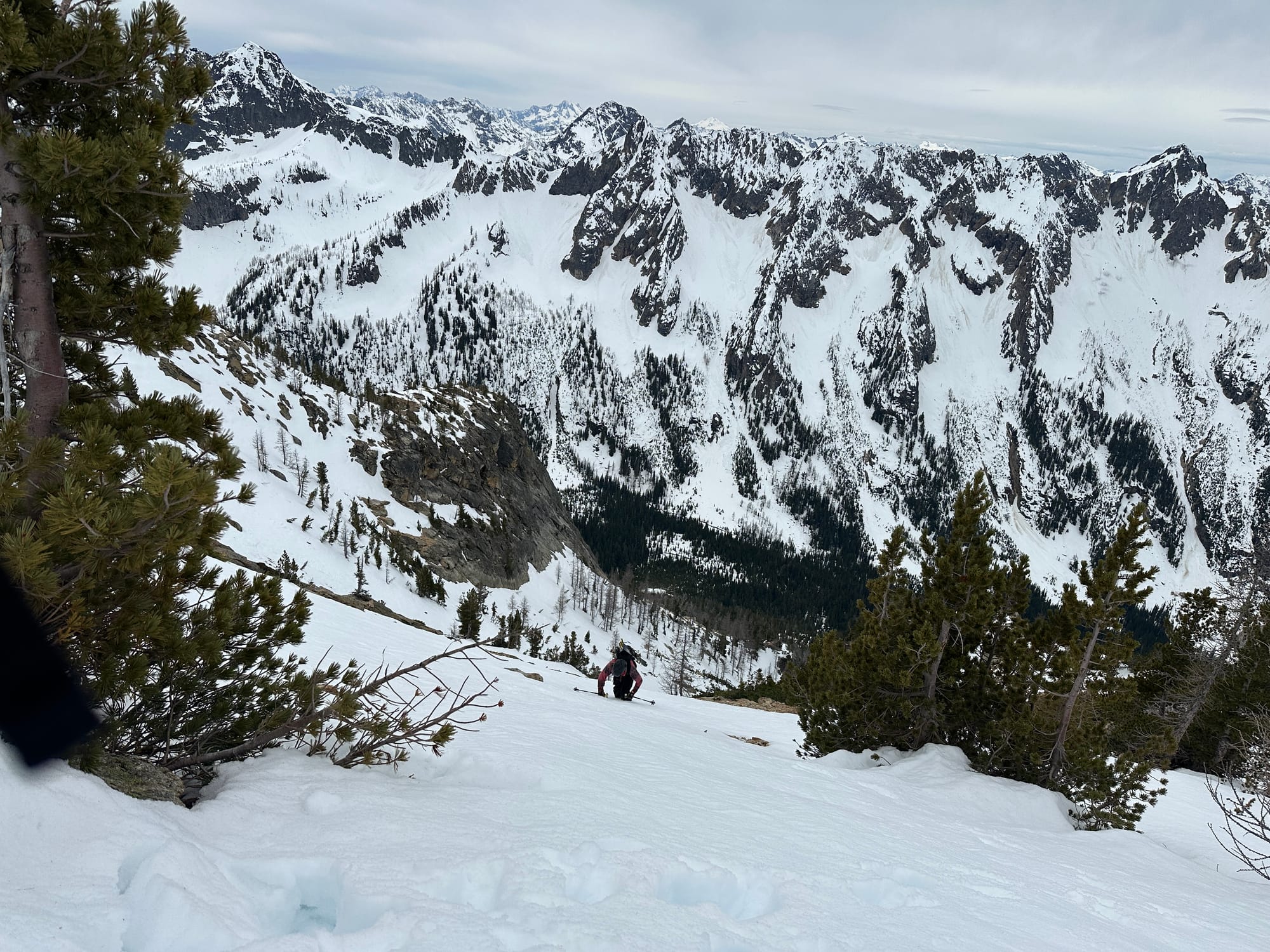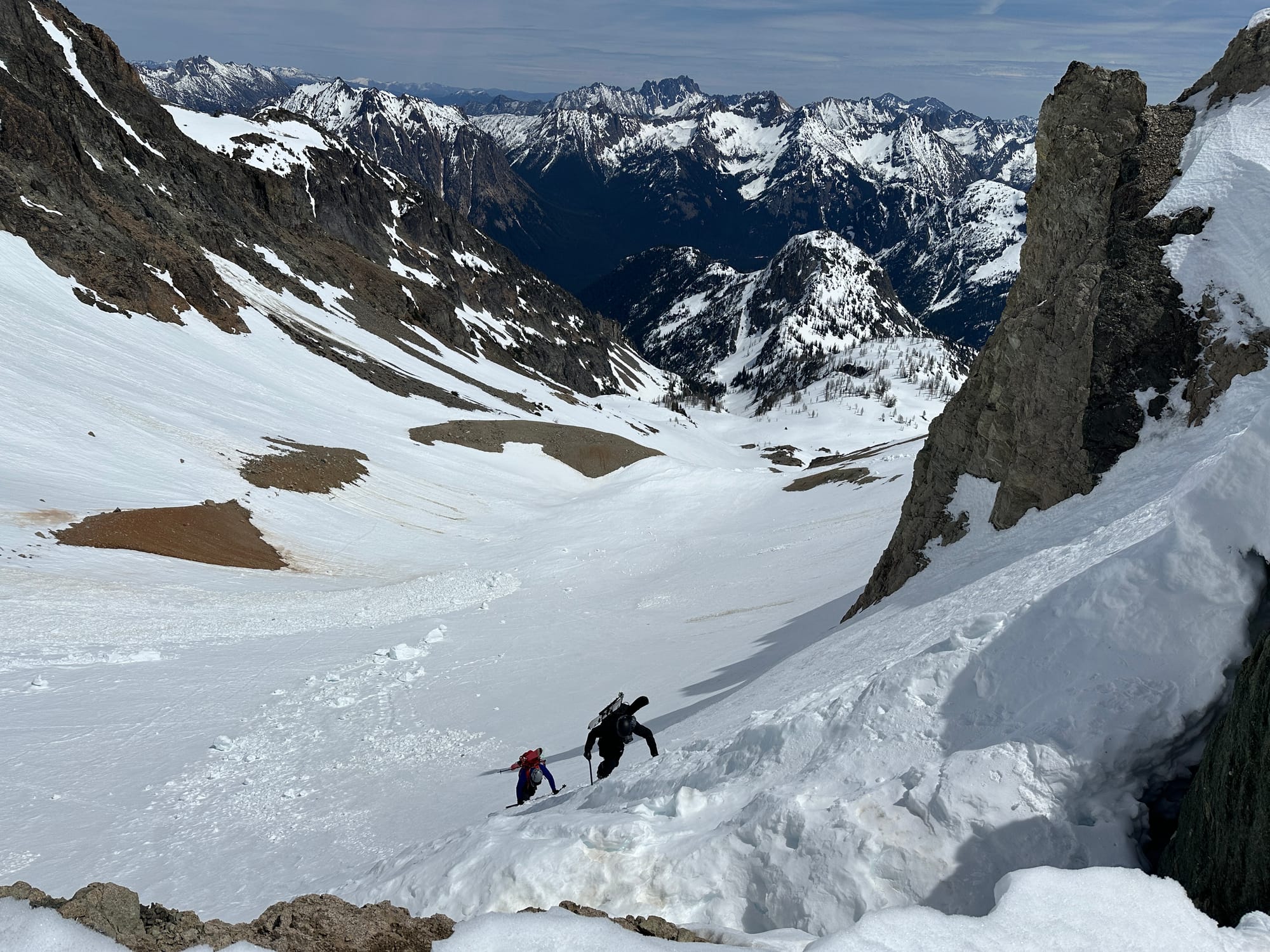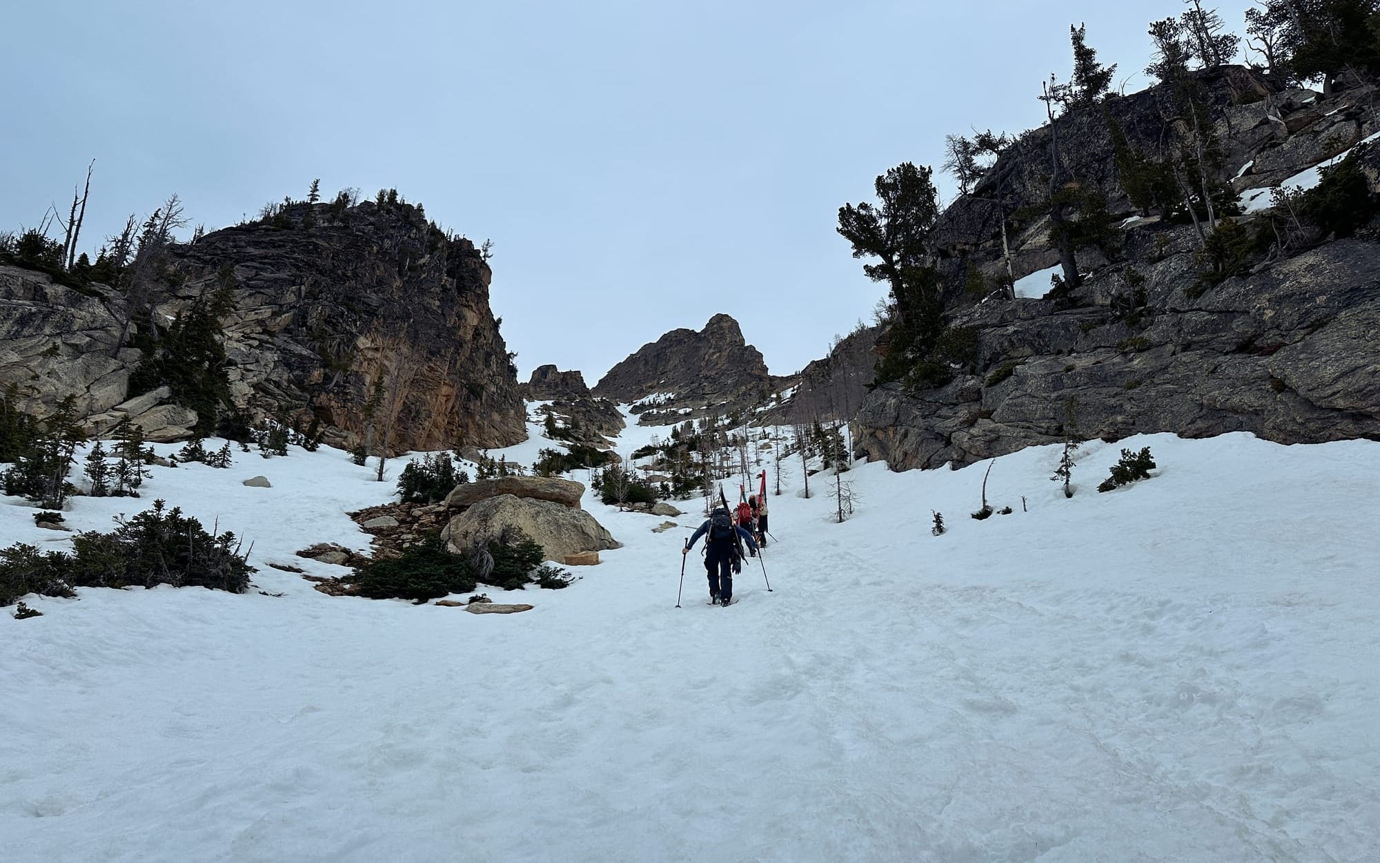 Once the group had their fill of scrambling we transitioned our skis and started excitedly down the steep line. Despite the snow being in poor condition for climbing, it was in pretty great condition for skiing. The slush made for well controlled turns despite the pitch of the run, letting us open up and ski strongly despite tired legs. We took it one-by-one and skied a few hundred feet lower than where we started booting, where we transitioned back onto the rock to regain the col so we could drop back into the basin leading us to Wing Lake.