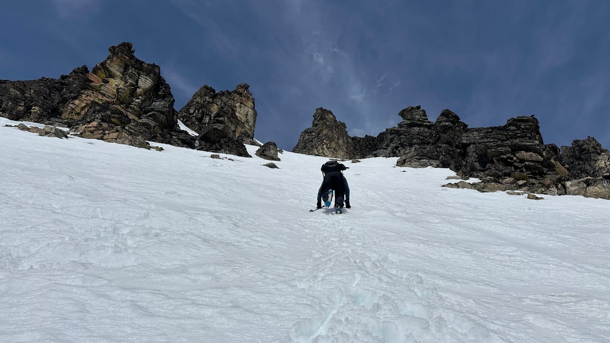 After stumbling through the loose rock we donned our crampons again and began booting up the final 1000ft or so of snow before the top of the line. The snow was warm and the exposed rocks heated it even further making much of the snow rotten below our feet. We tried to stay in the center where the snow was coldest, but post-holed a good percentage of our steps anytime we had to pass by exposed rocks. At one point we passed a rock formation that chocked the line into a narrow corridor, and a group mate sunk waist deep into the bergshrund-like opening that had formed underneath it where the snow had melted out significantly.