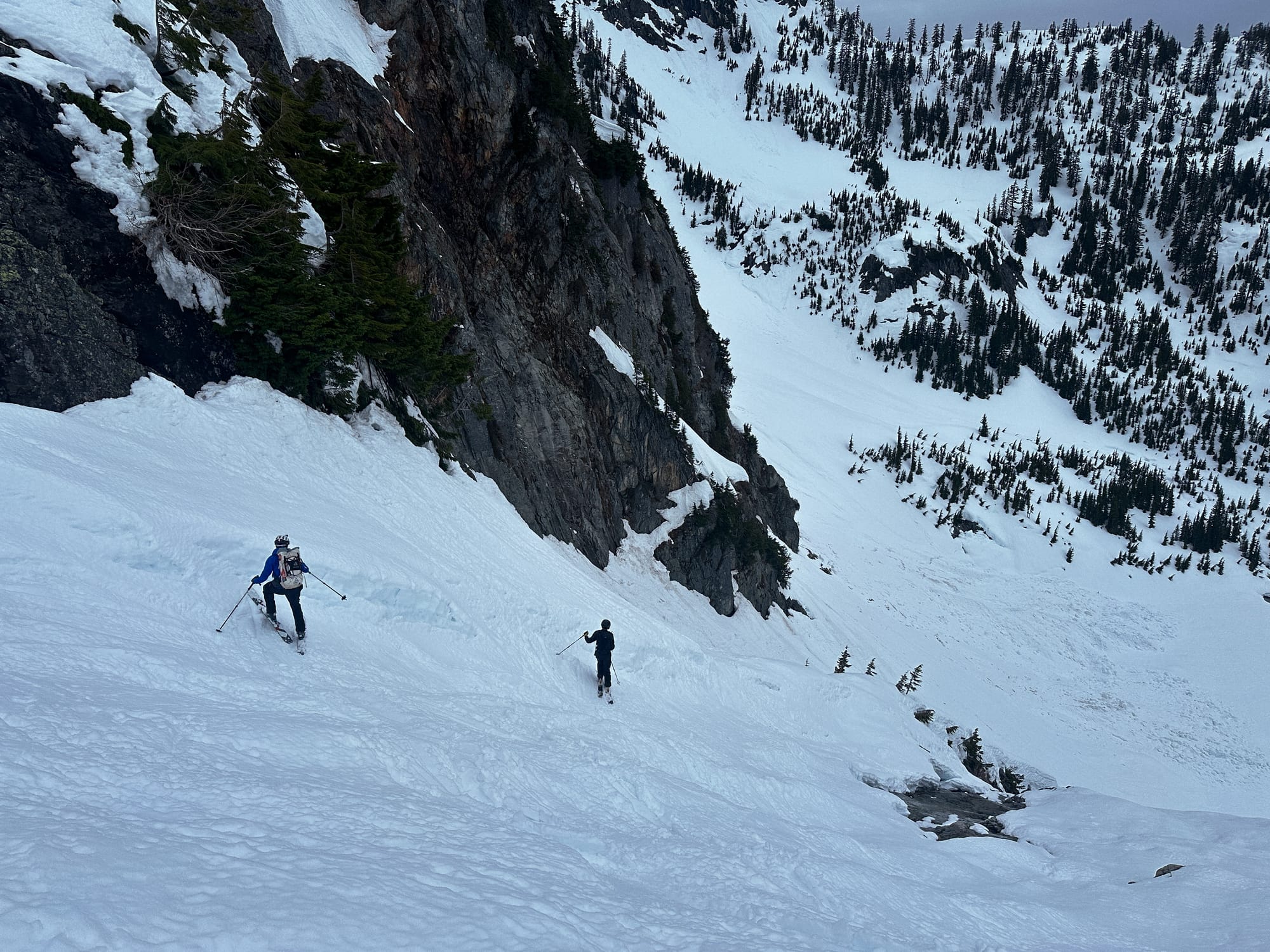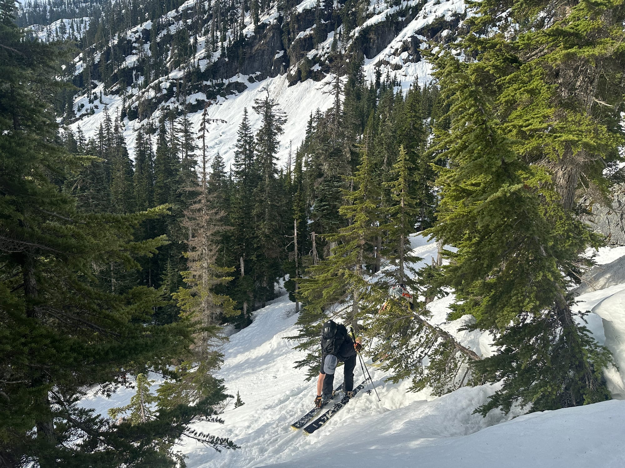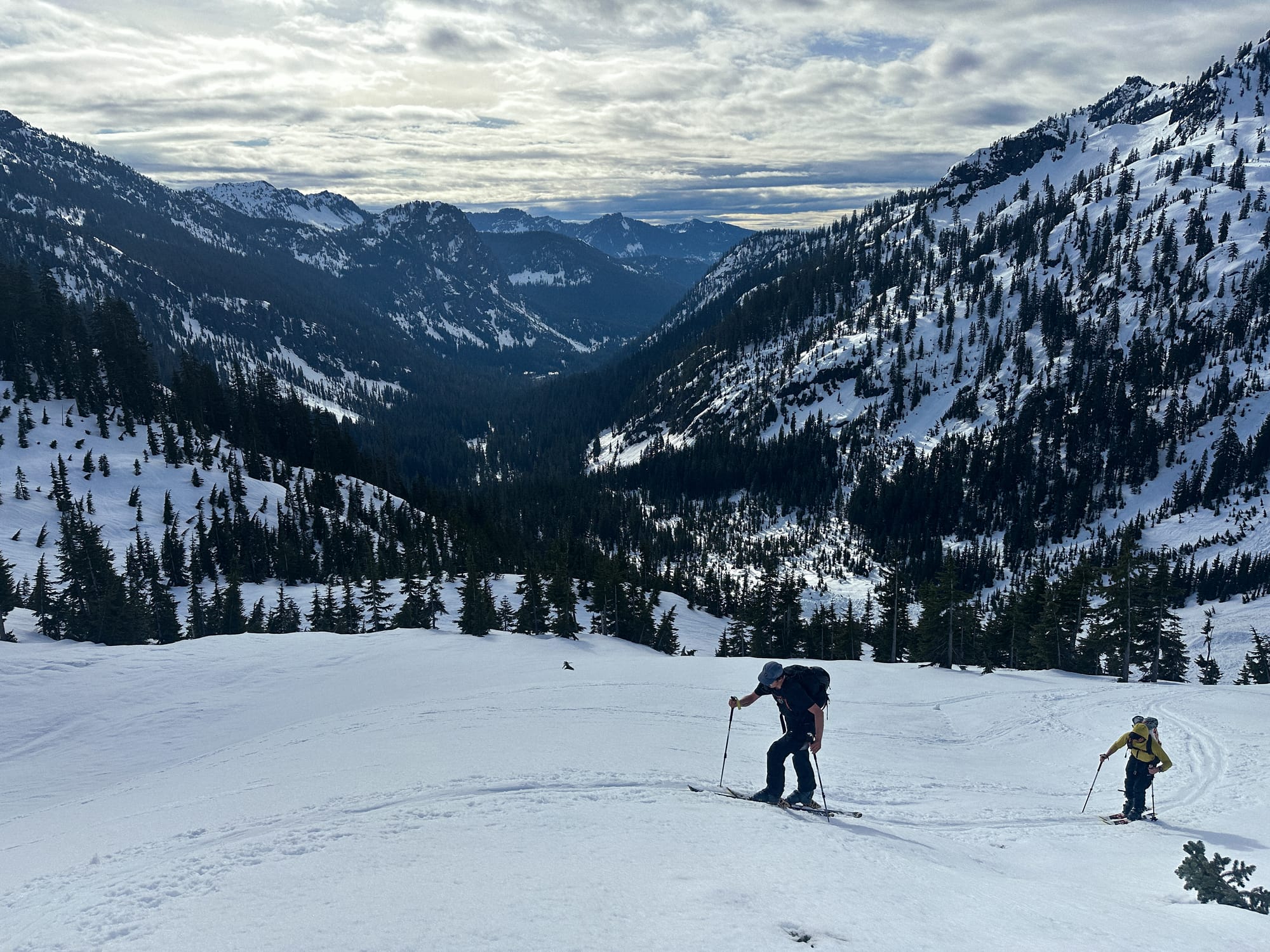 We had been making good time, but the sun had completely disappeared and winds were picking up, bringing in a swath of dark clouds. We quickly transitioned and started down the north slope. We had been working on the assumption that the north aspects would hold a somewhat supportive snow in the fall line, maybe even avoiding the severe warming of the more sun-forward aspects. The line had not been spared the high-temps though and had managed to hold onto more snow than the opposite side - leaving us with a thick gloopy mess. Skiing was slow and less enjoyable than we had hoped for. I found myself having to jump into every turn just to extract my tails from the heavy clumping and push my tips through the next turn. It was a struggle to get more than a handful of connected turns together as we pieced our way down the new terrain.