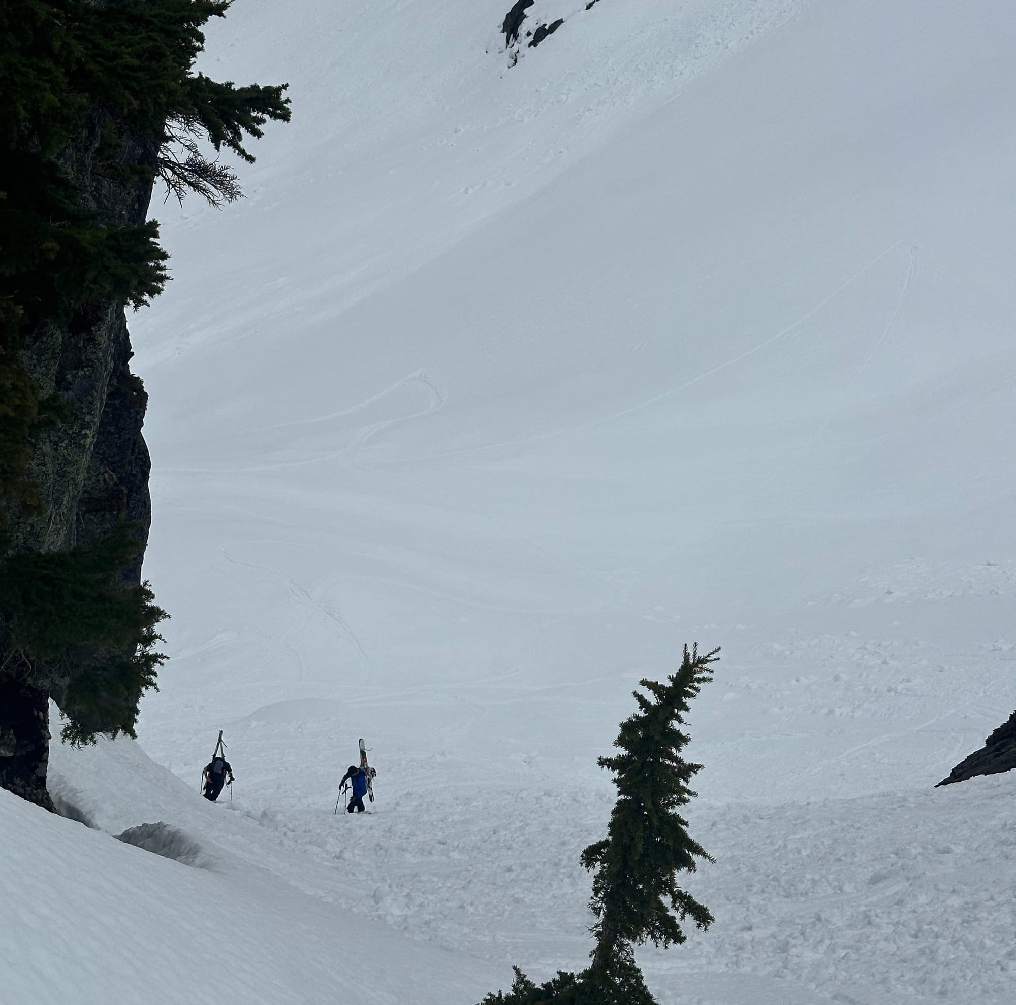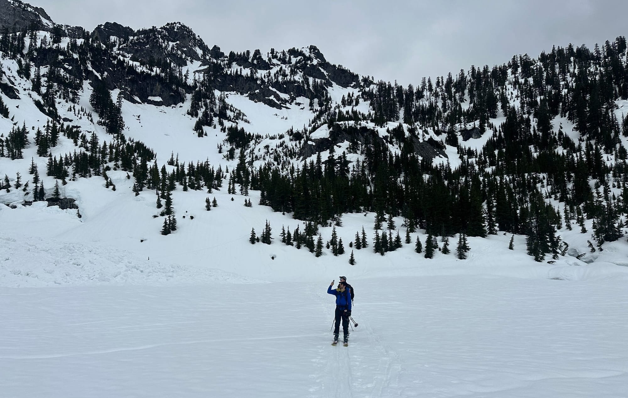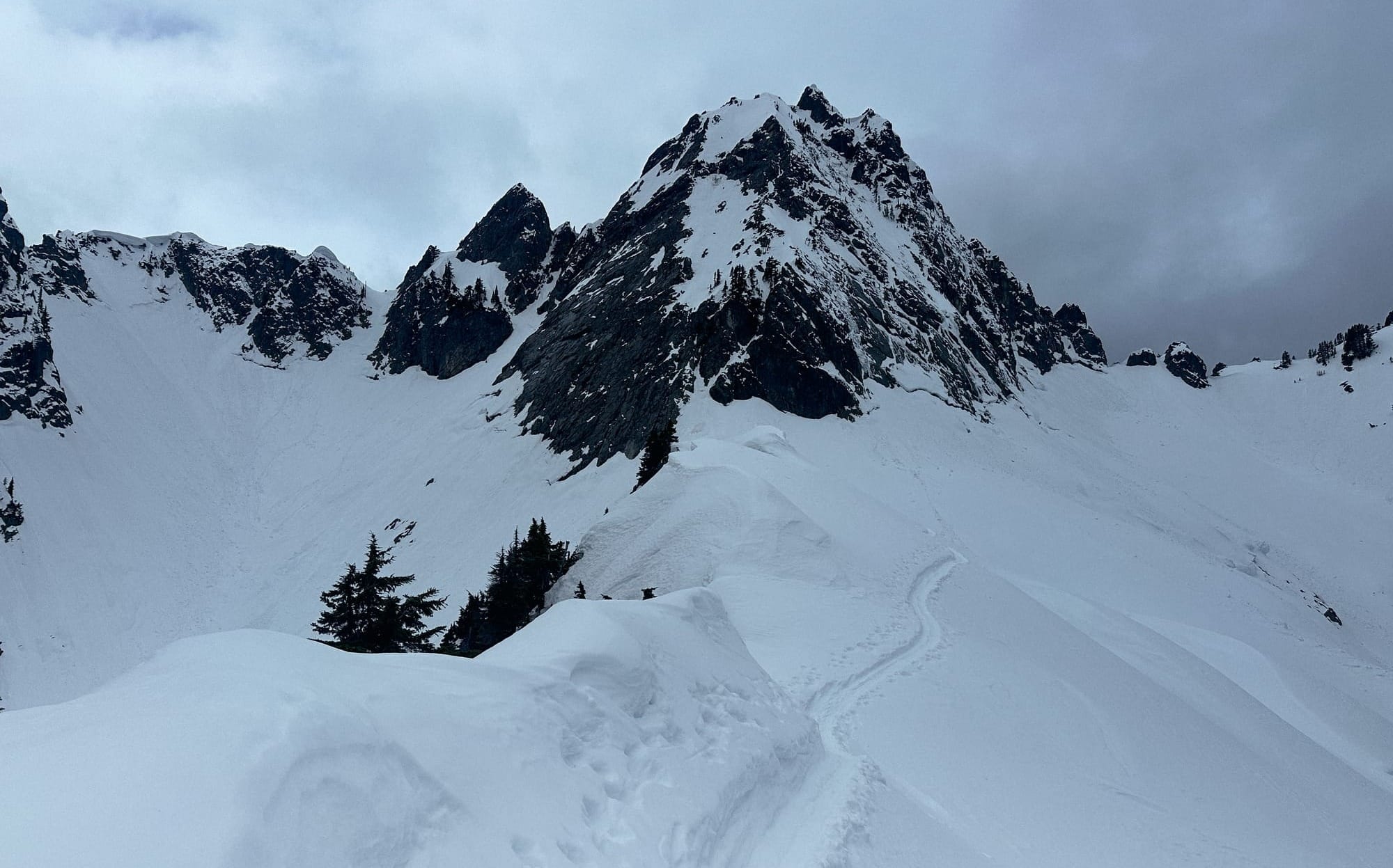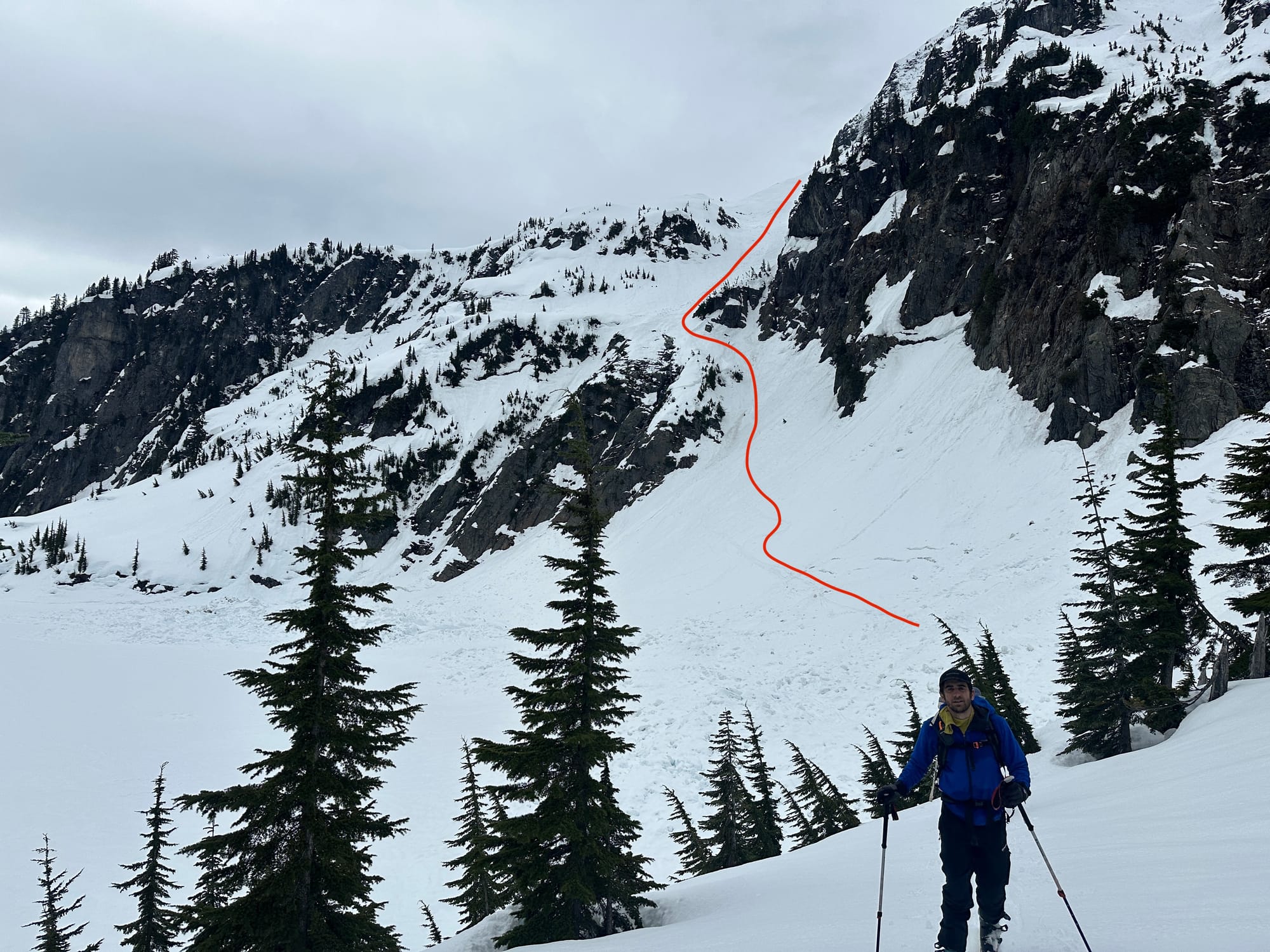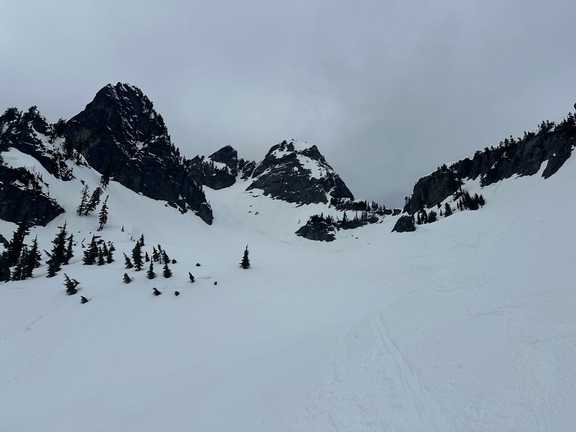 The route was straightforward enough, following the obvious fall line for 1000 feet until it ended in a large cliff band and we had to navigate through a slight choke and down a steep run off to Snow Lake's west end. Snow Lake was similarly covered in avalanche debris so we skirted across and began deliberating about our next steps. The conditions had slowed our pace and tired us out so our arrival at this point was already slightly delayed, but the incoming clouds spooked us that our window had already shrunk. This spot put us somewhere around half-way and given our current pace completing the loop would have us finishing just when the rain was originally supposed to start. Between the timeline and hesitations about the conditions we would find there were enough yellow-to-red flags to send us packing.