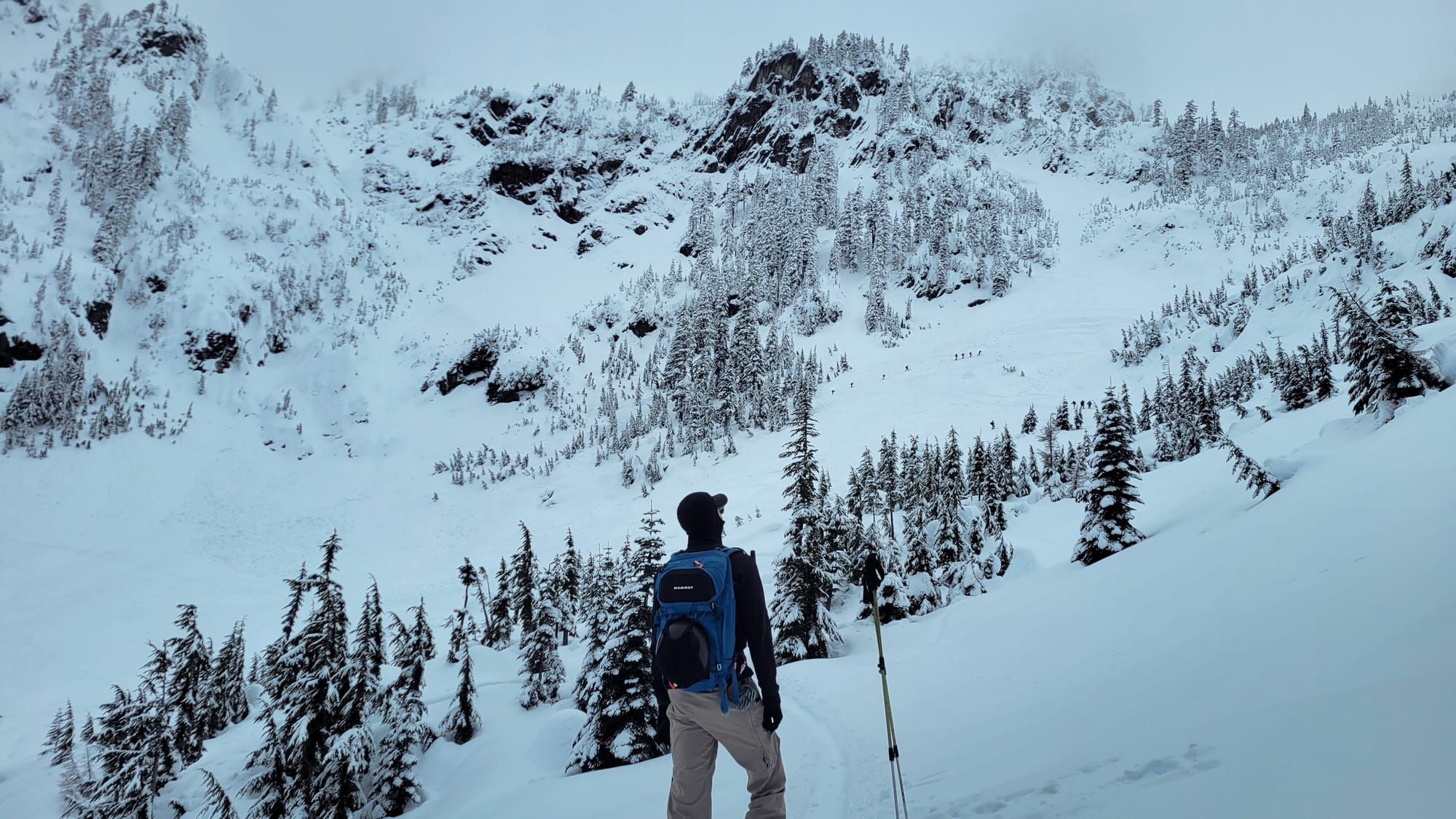 Instead, we descended the small amount of vertical gain we had made in the trees and followed the Snow Lake trail into Source Basin, talking through all of our other options. We decided to cross the divide to Snow Lake and keep searching for north-facing slopes as our best hope for light snow.