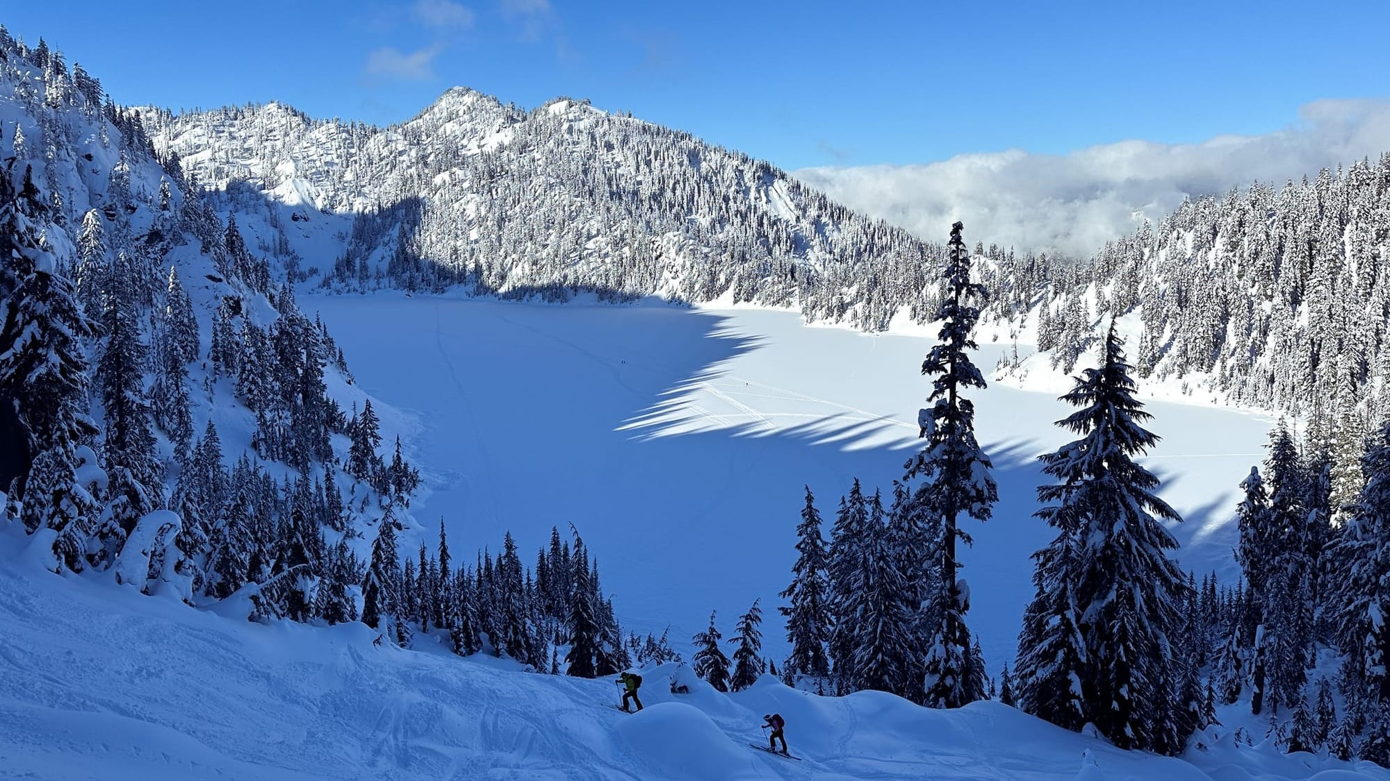 We were delighted with our decision. By the time we got to Source Lake, the snow quality had already improved dramatically, and we found at least a foot of beautiful powder as we descended down to Snow Lake. We skied the classic descent and then lines in the trees farther east, reveling in our conservative decision-making.